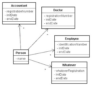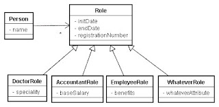It is not uncommon to see the same pattern when modeling peoples roles in many other Class Diagrams or even Data Diagram ( Entity Relation ) . Many developers usually create a class (or table) for each role like this: