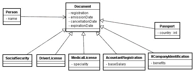 The Class Diagram above shows a Person with his/her documents the way as it is in the Real World. If a another Document Type is needed it can be added to the hierarchy just like the prior class diagram.