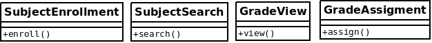 Each class represent a function in the system. Note that sometimes a use case may describe more than one scenario what can happen in CRUD functionalities such as Student Registration (which is not listed in our example diagram).