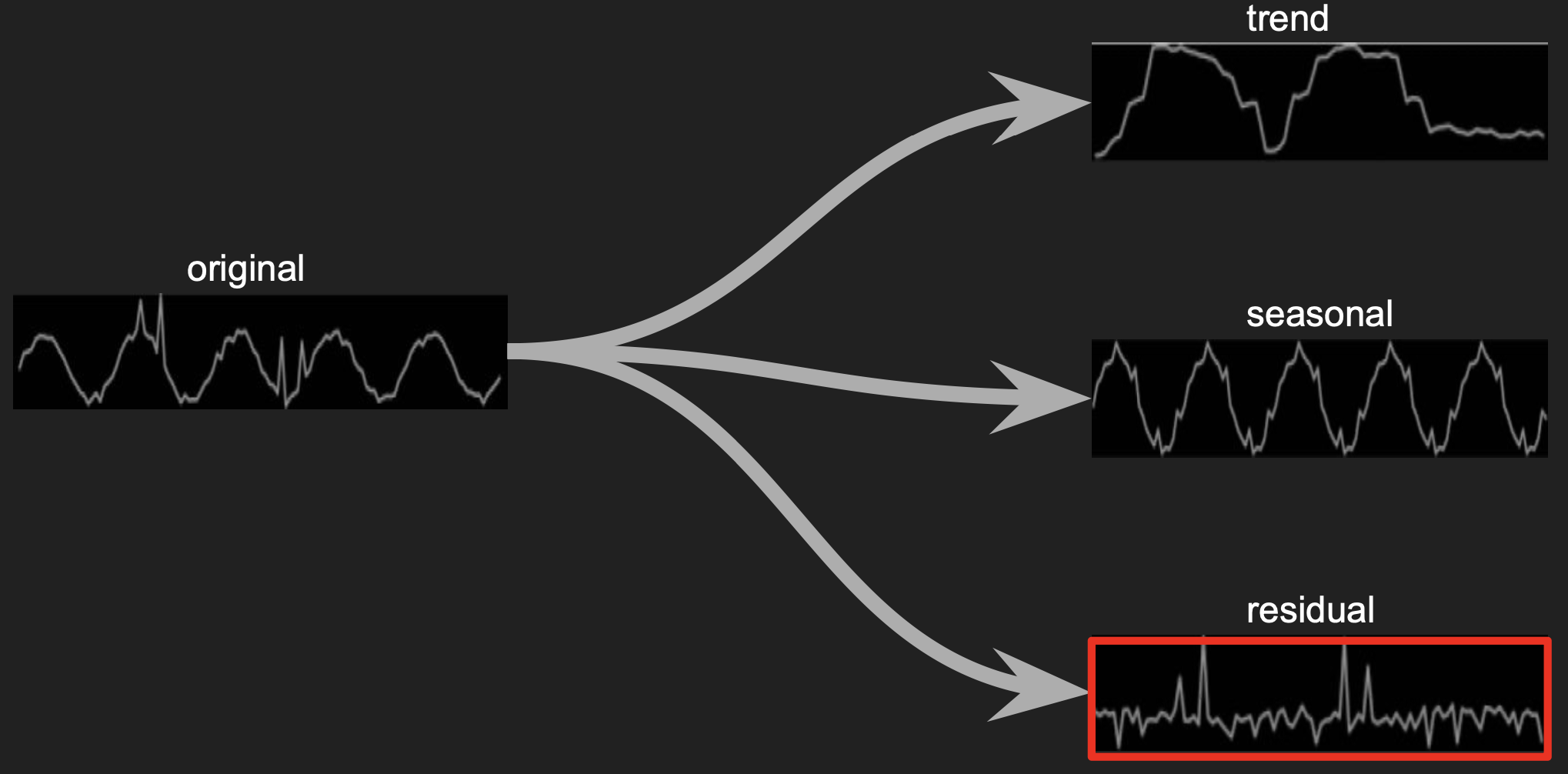 Specifically, the residual which is free from the trend and seasonality information becomes the component of interest in anonmaly detection.