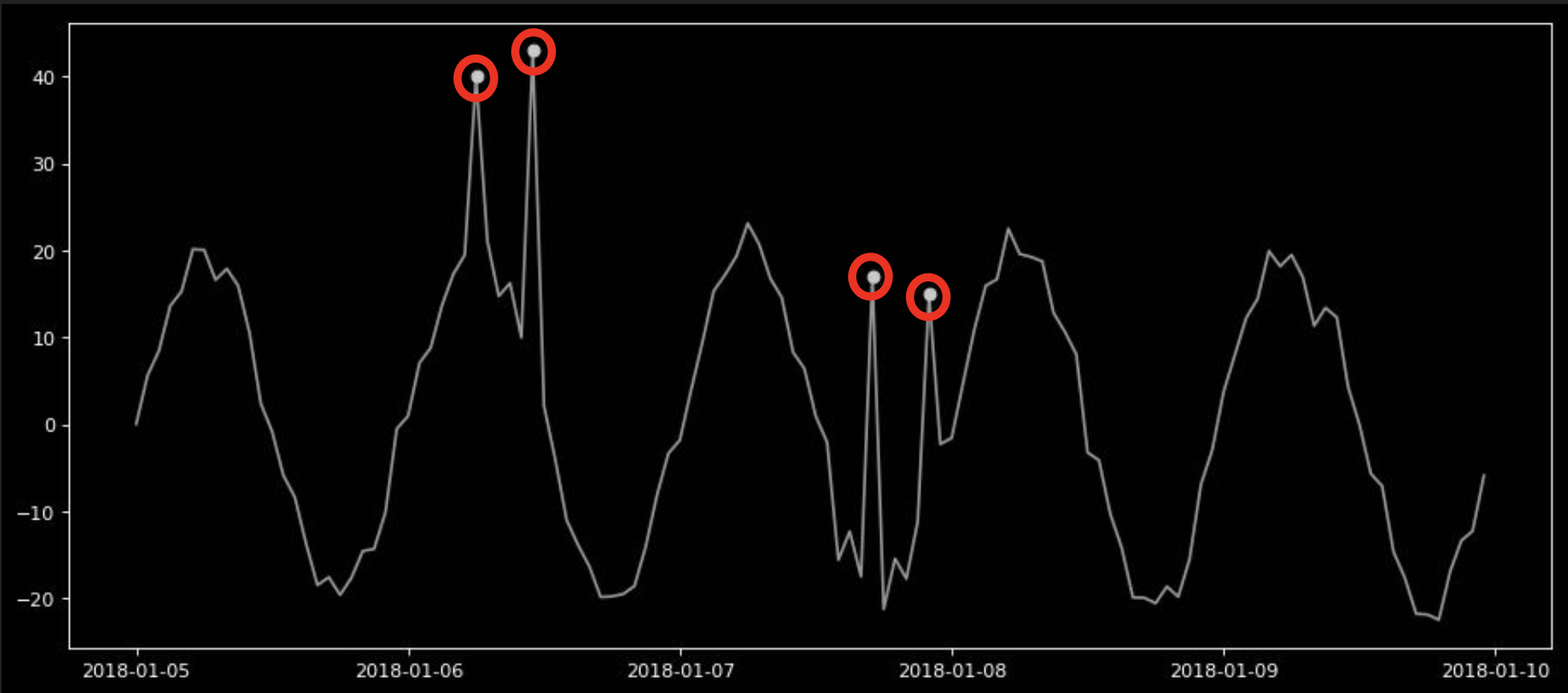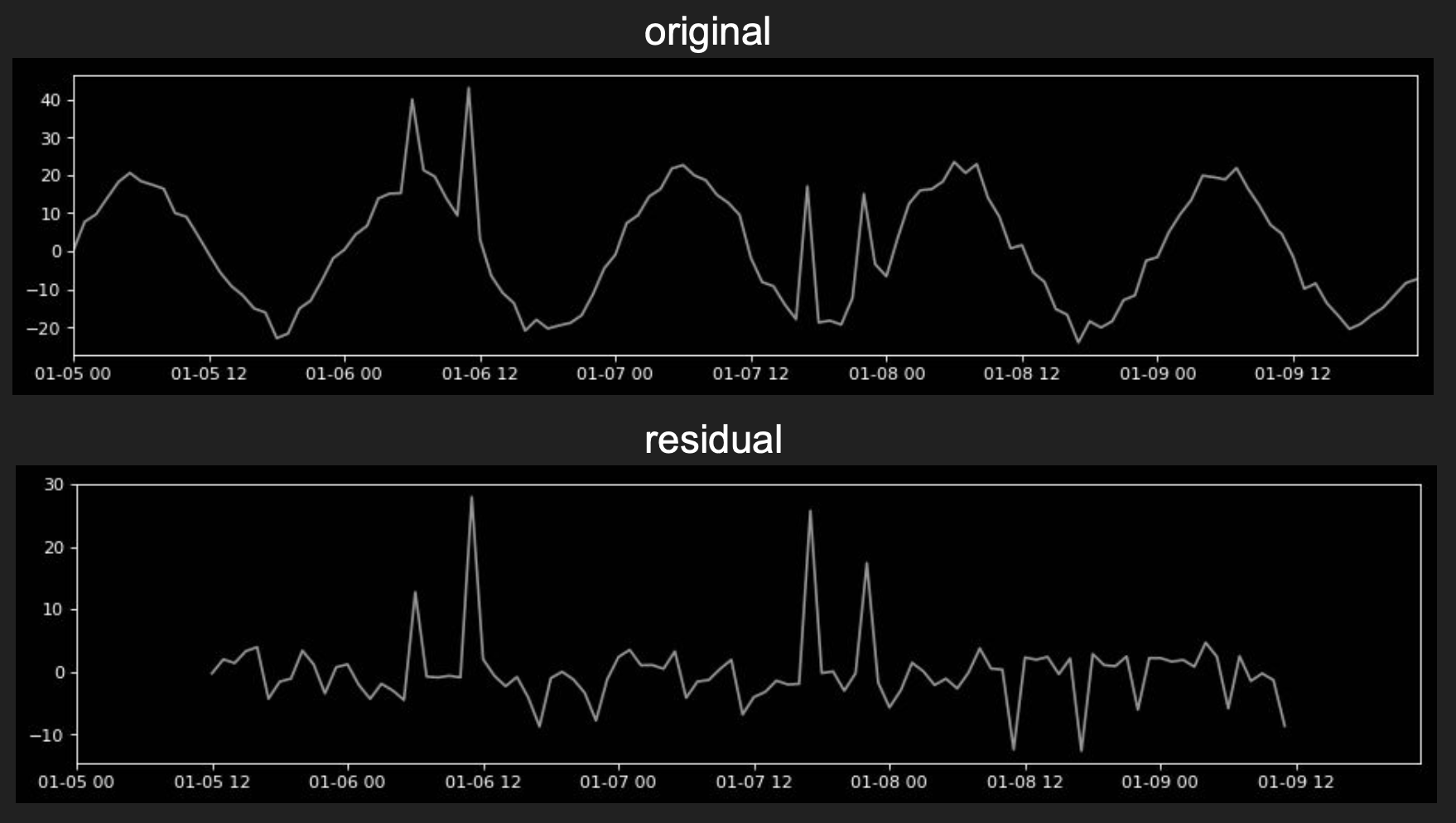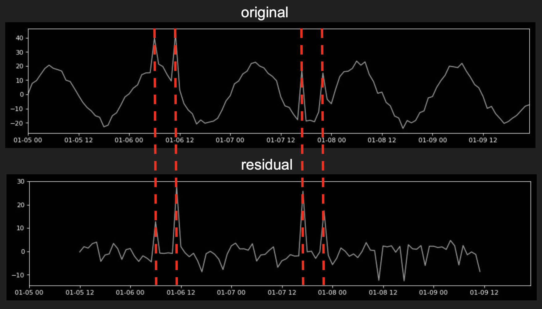 After that by comparing the original signal with the residual, it becomes apparent where the anomalies are even those inside the typical signal range.