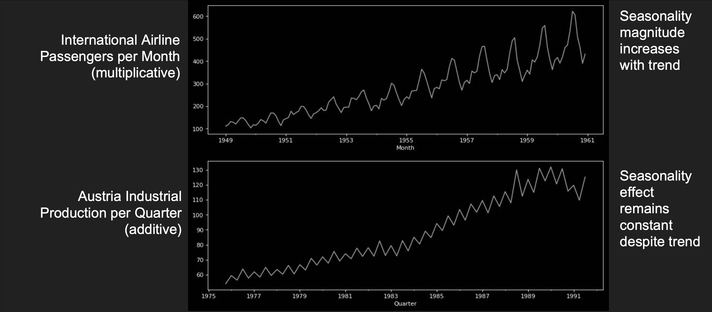 Timeseries properties change can follow an additive or multiplicative behavior.